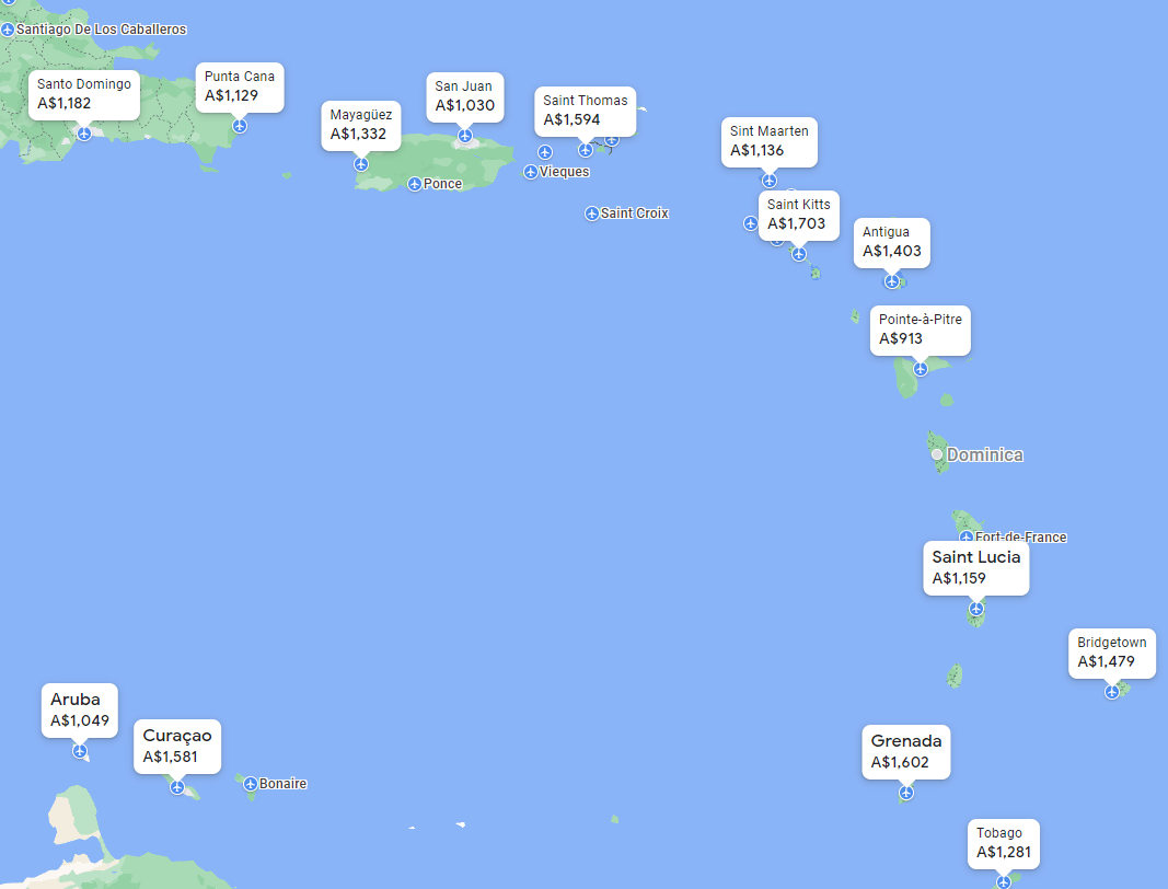 - Dominica Curaçao KLM 1 stop 12 hrs 15 min A$1,581