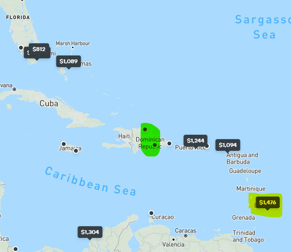 This is a random search I did for flights from the UK to the Caribbean I did in July for a week in September using the Kayak tool conducted after costs had risen to take in the fuel rate hikes at the time.